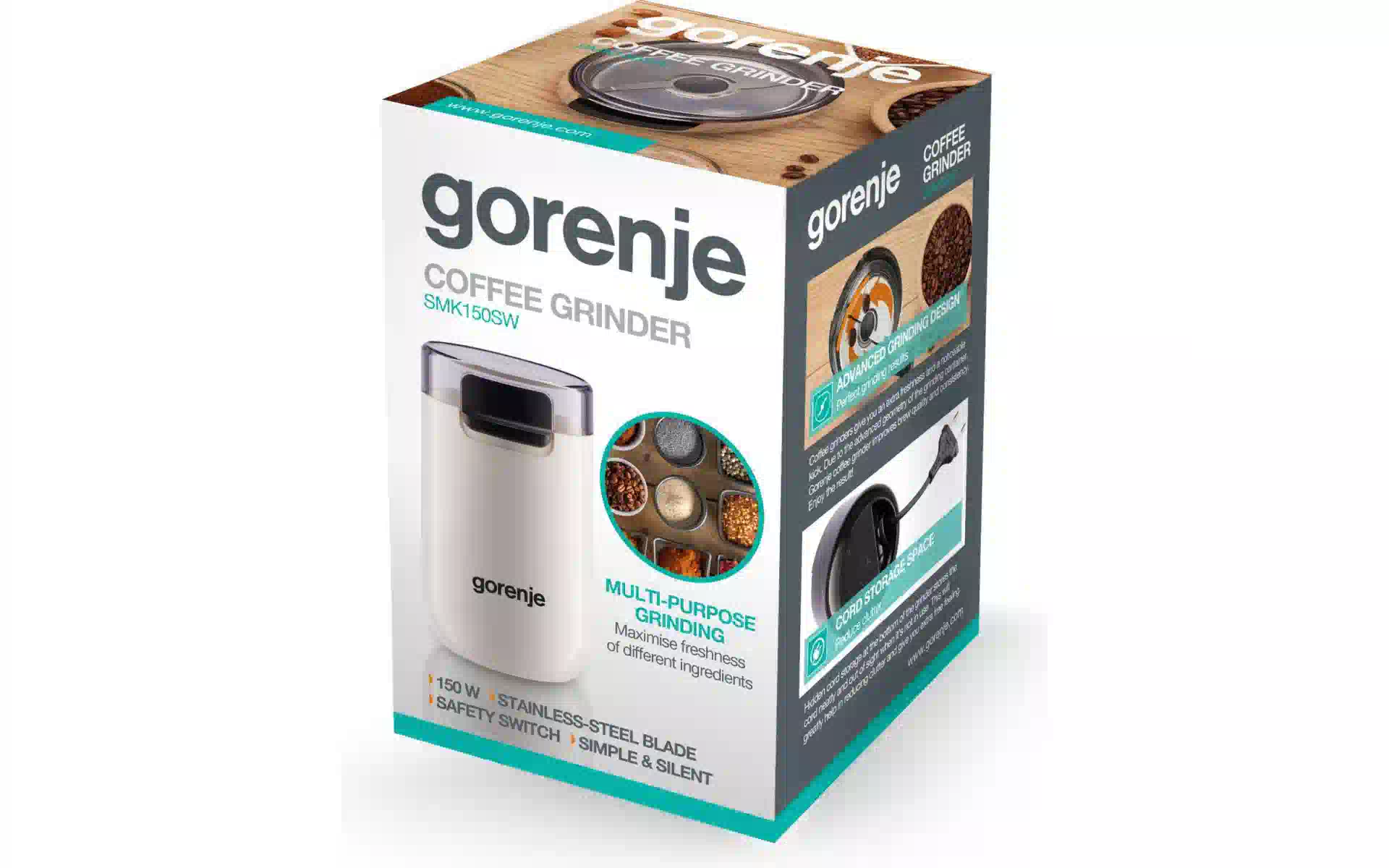 Kaffeemühle mit Rotationsmechanismus Gorenje (SMK150SW) Kaufen Sie neu und original, voll ausgestattet, ohne Auspacken in der Ukraine, in einem Lager in Kiew, mit offizieller Garantie und technischem Support vom Hersteller in der Ukraine.