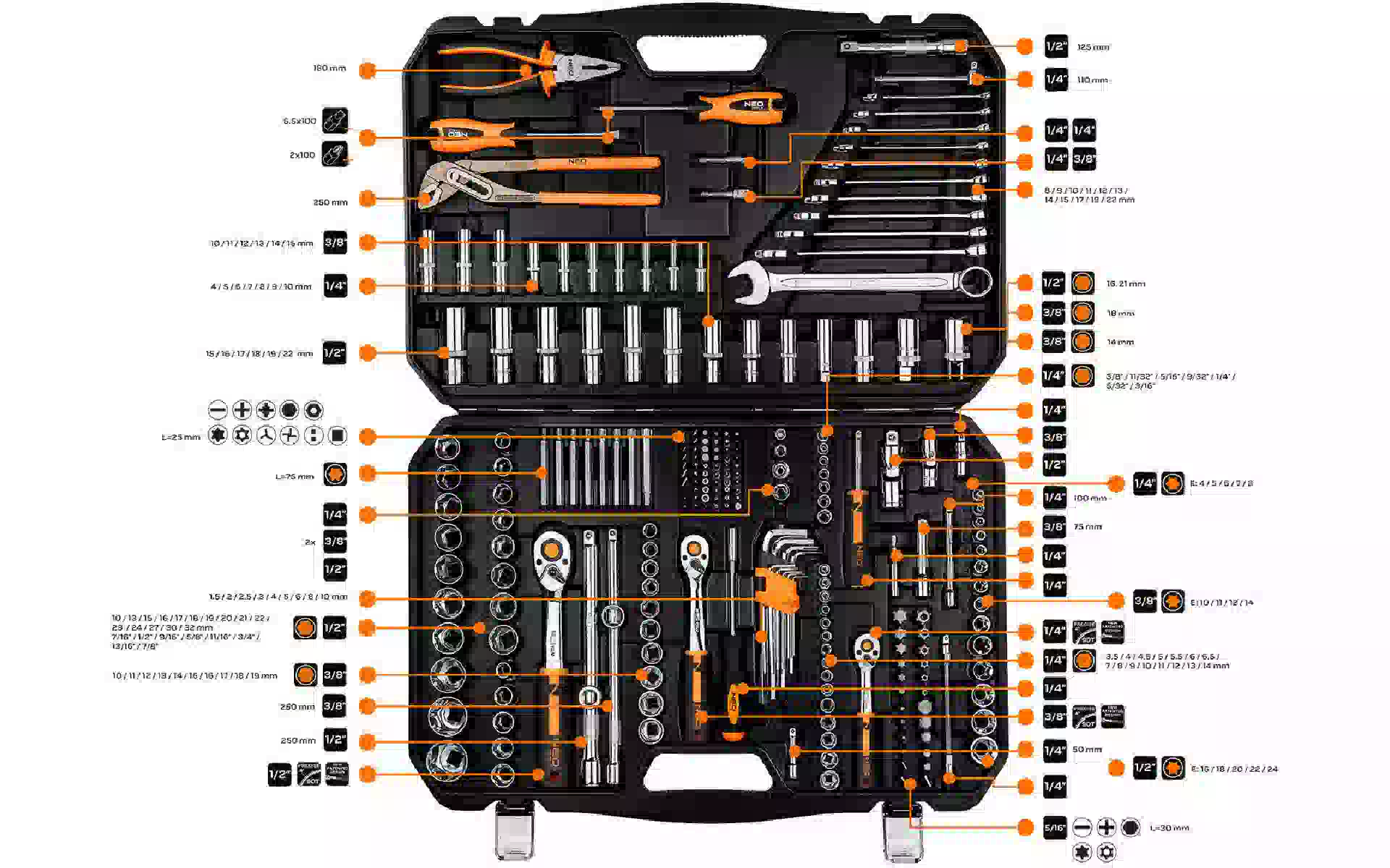 Werkzeugsatz Neo Tools (10-078) Kaufen Sie neu und original, voll ausgestattet, ohne Auspacken in der Ukraine, in einem Lager in Kiew, mit offizieller Garantie und technischem Support vom Hersteller in der Ukraine.